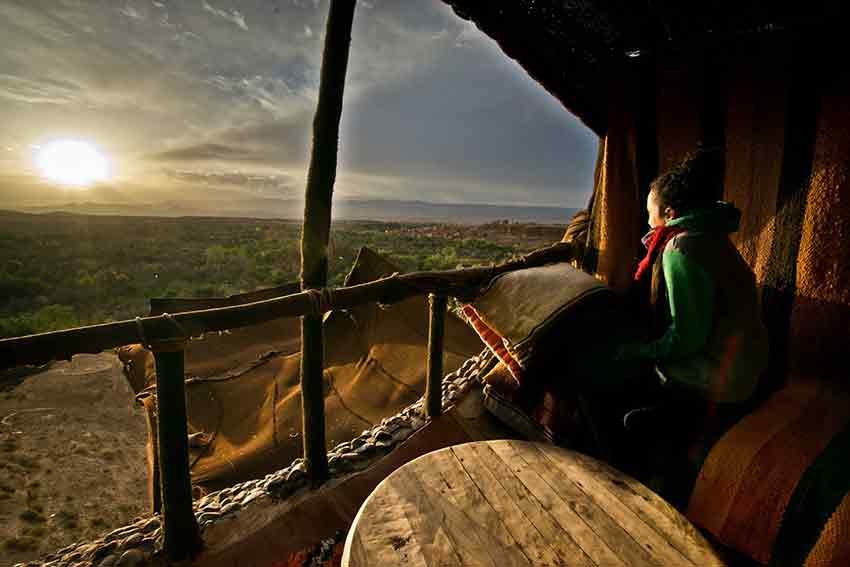 Por la mañana atravesamos en vehículo el Valle de las Rosas hasta la aldea de Tigramatine desde donde accedemos a pie al antiguo pueblo judio de Hadida. Subimos al collado del Moggtal para luego descender hasta las gargantas del río Talkadit. Cruzamos estas bellas gargantas y llegamos a un precioso vivac situado en las mismas gargantas. Allí tenemos instaladas varias tiendas nómadas y otras iglu donde pasamos la noche. En total son unas 6 horas de marcha pero el que quiera hacer el recorrido en vehículo, cuenta con esa posibilidad. Para los niños también es posible hacer el recorrido de una manera mucho mas divertida, a lomos de mulas.